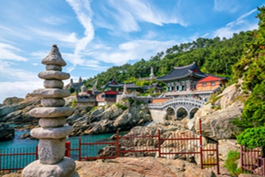 【海上寺廟:海東龍宮寺】主奉觀音菩薩,與襄陽洛山寺、南海菩提庵並列韓國三大觀音聖地,最初稱為普門寺,1974 年後因住持夢見白衣觀音乘龍升天,便將寺廟名稱更名為《龍宮寺》。此寺廟信徒眾多,人聲鼎沸與浪濤拍打崖邊,激起陣陣的雪白浪花相互輝映,十分壯觀,此 時,不妨入境隨俗,在祈願瓦片上寫上自己的願望,保佑心想事成,據說相當靈驗。