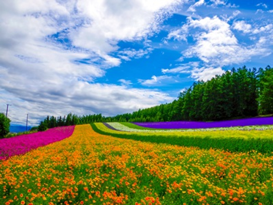 【 四季彩之丘】位於視野遼闊、風景絕佳的丘之町美瑛,面積達15公頃,非常廣闊,種植著各式各樣的花朵作物,形成有如拼布一般色彩斑斕的夢幻美景,是美瑛最具代表性的象徵。欣賞鮮豔花海的同時,還能眺望遠峰壯闊的十勝岳山脈,景色令人難忘。