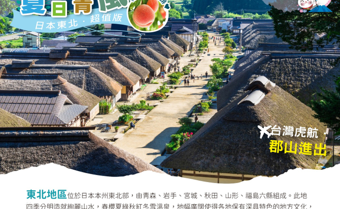 【會津若松城】又名「鶴城」,於1965年多次重建,2011年天守閣紅色瓦頂,重現了當年雄偉英姿。鶴城除了是日本百大名城之外,還被選為日本櫻花百選之一的神聖景點,春天有櫻花、秋天有紅葉、冬天則是漫天白雪的美景,不管什麼時候來都非常適合!【塔崖】塔崖經過100萬年的時間,受河水侵蝕和風化形成,由於這裡的奇石像塔一般沿河排列,因而就得來了塔崖的名字。塔崖的特色是和崖連接的吊橋,在橋上可以同時看到斷崖和大川的風景;橋的一端還供奉著「虛空菩薩像」,作為一處能量景點為人們所熟知。塔崖四季風景出眾。夏季是綠色的山藤,秋季被紅色和黃色的楓葉點綴。【大內宿】與岐阜縣白川郷合掌村及京都府美山茅葺之里並稱為「日本三大茅葺屋集落」。茅葺屋就是在日本常見的茅草屋,最大的特色就是屋頂採斜面設計,再覆蓋著厚實的茅草。大內宿的茅葺屋多規劃成商家或民宿,整整齊齊排列在一條約300公尺的街道上。【五色沼】是坐落於磐梯高原,好幾個水面顏色不同的湖泊總稱。由於從地底湧出的礦泉含有鐵、錳等大量礦物質,湖中的湧泉又使水的濃度産生變化,生長於沼底的水草和豐富的浮游生物,加上日光晝夜四季交替的因素,呈現出翠綠、湛藍、深紫、咖啡等各種神秘色彩,鮮豔的色彩令人陶醉。
