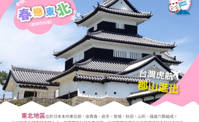 ◎特別說明:訂單成立後將立即確認機位與訂房,並以客服人員通知為準(約需2~3工作天確認時間)。若遇通知滿位或飯店滿房,您可選擇其它時間出發或將已付款項將全額退還。◎費用包含:1、台灣/日本郡山空港來回經濟艙包機團體機票一張。2、兩地機場稅、燃油附加稅、雜支服務費、行李20公斤及手提行李10公斤。3、優質飯店住宿二人一室及全程列表餐食。4、行程所列之旅遊交通費用、門票入場費。5、履約責任險新台幣500萬元。6、本行程旅遊責任意外險及旅遊意外醫療險依法令規定金額投保。7、此報價已經分攤65歲以上老人與小孩的優惠票價差,如產生恕不退還優惠票價差。◎費用不包含:1、行程表上未表明之各項開支,自選建議行程交通及應付費用。2、純係私人之消費:如行李超重費、飲料酒類、洗衣、電話、電報及私人交通費。3、個人護照新辦之辦理費用NT$1,800/人。4、若無法安排室友或指定住宿單人者,須補單人房價差,詳情請洽當團業務。5、導遊、領隊、司機人員小費每日NT$300 /人(參加日本團NT$300X 4日= NT$1,200/人) 。 【特別說明】1、此行程需16人以上方達出團人數,如人數不足無法出團將於出發前七天通知。2、每位團員訂金NT$15,000元整。(※提醒您:當您繳付訂金即表示旅遊契約產生效力,本公司將依各協力商之要求,為您預付此趟旅程的旅館、餐廳或機票等費用。若您因故取消,本公司將依「國外旅遊定型化契約書」之相關條款或估算已實付的費用,向您收取超支費用或退回剩餘訂金。)3、團費報價以雙人房(2人一室)為準,歡迎您結伴參加。單人者報名,需補全程單人房型價差,該金額請洽當團業務,原則上我們會協助安排同性別團員共用一室,若能安排兩人一室則免收單人房差額。(單人房差係指「單人指定入住一間房之價差」)。4、國際觀光旅館房間以雙人房2張單人床為基準房型,如遇特殊房型需求(大床房型、三人房),請事先提出需求,但無保證一定有此房型;大部份飯店無三張正常床型之三人房,也無法提供雙人房加床,如旅客需求三人同住一房,全球飯店幾乎都以統一型式之折疊床為加床,加床後室內空間變小。基於房型與消防理由,最多僅能加一張床,或無法加床,敬請了解見諒。如無法接受此安排,建議勿需求三人同住一房;若遇部分飯店無法提供加床服務,則請補單人房差,或與其他團員同房住宿,敬請見諒。5、素食者;因各地風俗民情不同,國外的素食習慣大多是可以食用蔥、薑、蒜、蛋、奶等,除華僑開設的中華料理餐廳外,多數僅能以蔬菜、豆腐等食材料理為主;若為 飯店內用餐或一般餐廳使用自助餐,亦多數以蔬菜、漬物、水果等佐以白飯或麵食類。故敬告素食貴賓,海外團體素食餐之安排,無法如同在台灣般豐富且多變化,故建議素食貴賓能見諒安排不易或自行準備符合口味及方便攜帶的副食品、點心備用,如餅乾、泡麵..等,以備不時之需。6、行程順序若因特殊狀況及其他不可抗力之現象,如:天候、交通、航班、船舶影響,而有飯店、景點、餐食順序上之調動,本公司保留變更或調整行程之權利。7、如因個人因素無法成行,已繳付之團體費用恕無法退還。8、因飛行安全考量及法規限制,台灣虎航規範每航班嬰兒人數上限為10名。如欲攜帶2歲以下嬰兒同行(以參加之行程返國日計算),煩請提供嬰兒及同行者名單,待服務人員與台灣虎航回覆預訂OK後,方完成訂位。嬰兒訂位將以入名單先後順序受理,額滿即不再接受,敬請留意。9、團體機票使用限制:※為免爭議,敬請於購買前詳細閱讀。a.團體行程使用團體來回經濟艙機票,需「團進團出」,一經開票不可延回、不得退票及延期使用。b.團體行程使用之票種為團體機票,機票無法累積航空公司哩程數、不可事先指定座位或劃位。(航空公司依照乘客之英文姓名之字母先後順序作訂位紀錄以及機上座位排序。)c.為響應環保及考量作業之便捷,本行程將以電子機票取代紙本票根列印。如欲取得搭機證明,請於搭機後盡速向業務提出申請;另需加收手續費100元(單程)。10、如航班為(加)包機,航班時間為暫定時間,正確起降時刻請以說明會資料為準;將依兩國政府及航空公司公佈為準。若有調整,本公司將保有行程前後順序調整之權。亦盡全力維持原行程之規劃,調度考量恕無法退費及取消。11、因全球氣候異變、自然生態難以準確評估,開花週期亦無法掌握,遇天候因素(下雨、颱風、氣溫...)難保證開放的程度,其凋謝或未綻開會依往原景點純欣賞,敬請貴賓於報名前自行斟酌衡量,並請見諒,謝謝您。★【特別說明】日本國土交通省於平成24年6月(2012年)發布最新規定,每日行車時間不得超過10小時(以自車庫實際發車時間為計算基準),以有效防止巴士司機因過(疲)勞駕駛所衍生之交通狀況。(資料來源:日本國土交通省)