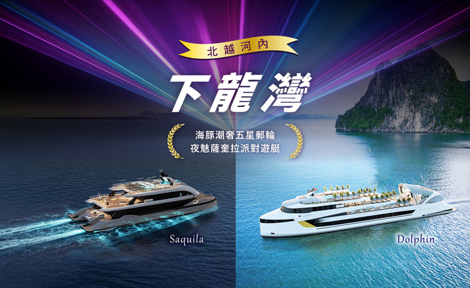 加碼!加碼!加碼!嚴選搭乘全新下水潮奢盛世海豚郵輪日遊下龍灣,晚上我們升等各位貴賓搭乘現代感十足五星薩奎拉精緻派對遊艇,直接我們在船上享用海陸自助百匯,觀賞薩奎拉遊艇為各位貴賓準備的精采表演,下龍之夜~您準備好了嗎?