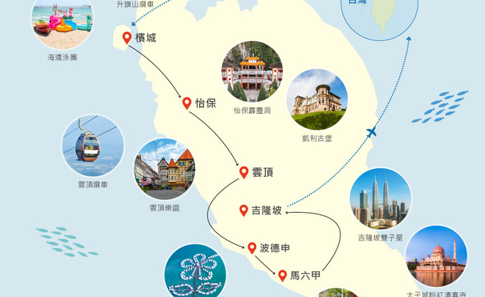 西馬半島全覽7日,帶您從北部的世界文化遺產城市檳城一路往南,經過怡保、武吉丁宜浪漫的法國村,續往和檳城同期列入世界文華遺產城市的麻六甲、以海上棕櫚別墅造型聞名的大紅花度假村,一次精彩收藏。