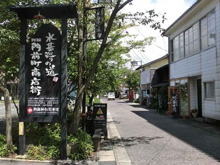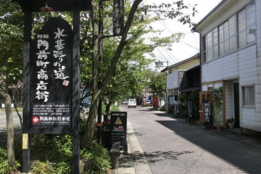 名為「阿蘇門前町商店街」的主要街道,也就是擁有2,500 餘年歷史的阿蘇神社參拜道路,街道上林立了不少雜貨小店、土產店、咖啡館等,在這“水基”指的是飲水的地方。在一之宮門前的商店街裡,隨處可見被稱為“水基”的湧泉。進行水基巡遊的同時,還可以順便逛逛沿途的老店及咖啡館。