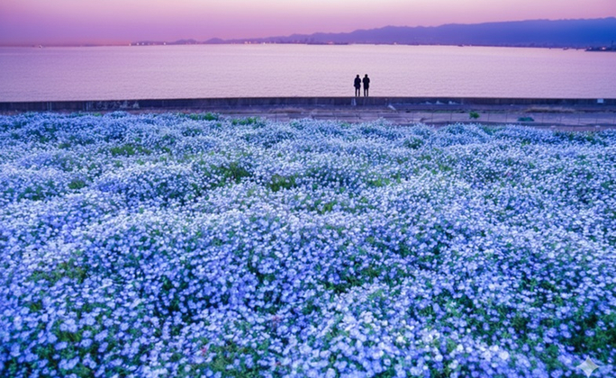 大阪海濱公園以大片藍色粉蝶花聞名,每年春季形成夢幻花海,花朵隨風輕輕搖曳,如同海浪般延伸至天際。漫步其中,感受花香與微風,搭配遼闊海景,絕對是春季賞花的必訪秘境。