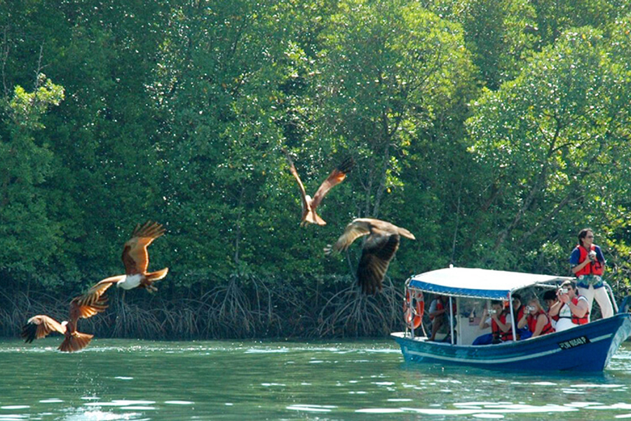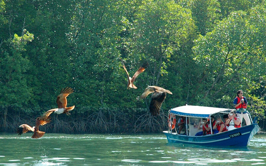 餵鷹是所有紅樹林觀光遊中最精彩的部分。見船夫將食物扔進船只附近的水中,等侯這些巨大的鳥類在上空盤旋,然後突襲它們的“大餐”。