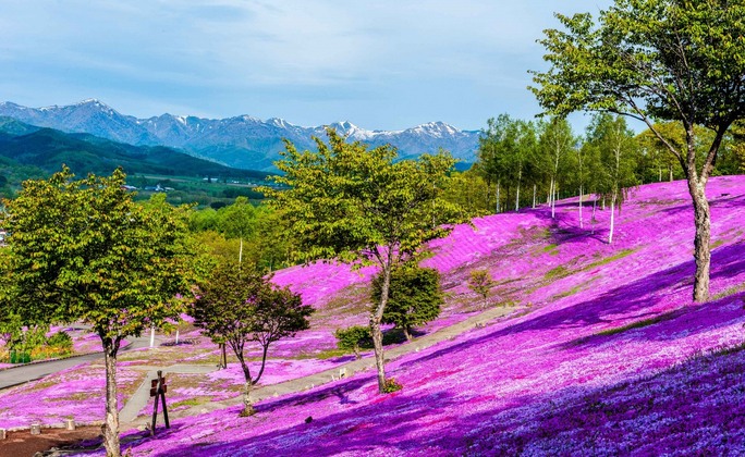 漫步在宛如粉紅地毯鋪滿山丘的 芝櫻公園,層層花海隨地形延展,視覺震撼又浪漫;接續造訪 浪漫鬱金香花園,繽紛色彩在藍天下盛放,怎麼拍都像明信片。