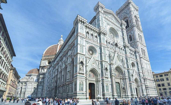 佛羅倫斯最象徵的地標,是一座哥特式風格的主教座堂,由粉紅、白色、綠色大理石交織成幾何圖案外觀,前後耗費了近150年時間才竣工,在完工將近六百年後,依然是今日世界最大的磚造圓頂教堂