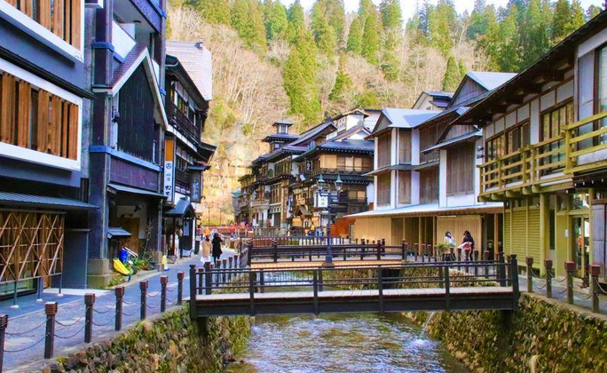 銀山溫泉街是在江戶時代因採銀礦而繁榮的溫泉街。轟動一時的NHK電視連續劇「阿信」就是以這裡的「能登屋」為場景。佇立在銀山川兩岸,大正時代的木造建築物櫛比鱗次。(遵照街坊保存條例,其景觀依然存留大正時期的情景)三層、四層重疊之屋簷瓦片訴說著銀山的悠久歷史;越過白銀橋,熱騰騰的煙霧沿著石子散步道旁緩緩上升,坐在特製的長椅上,雙足浸泡在溫泉裡,一邊眺望風景一邊。