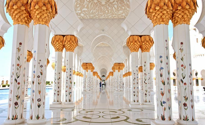 擁有全球最大圓頂的清真寺的榭赫扎伊清真寺Sheikh Zayed Mosque,建立9.5公尺的小山丘上,白色典雅的外觀,襯在蔚藍的天空下,顯得格外莊嚴,整座清真寺皆以義大利大理石材打造,內部以數以萬計的寶石貝殼鑲嵌,充滿伊斯蘭風情