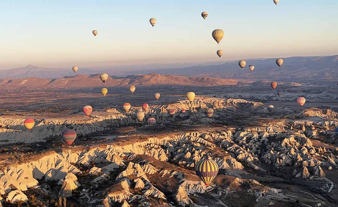 卡帕多細亞(Cappadocia)是土耳其最具魅力的旅遊勝地之一,不僅因為能在此搭乘夢幻的熱氣球,更因其豐富且特別的自然地形景觀而聲名遠播。這片神秘的土地由古代火山爆發所遺留的熔岩與火山灰堆積而成,經過百年風化與侵蝕,逐漸雕塑成世界罕見的奇岩石柱、洞穴與地下城,彷彿來自另個星球。黎明時分,當陽光灑落在這片起伏的岩石山谷上,數百顆熱氣球緩緩升空,繽紛飄揚於天際,從空中俯瞰壯闊的岩石山谷,也讓卡帕多奇亞被譽為「地球上的童話國度」。