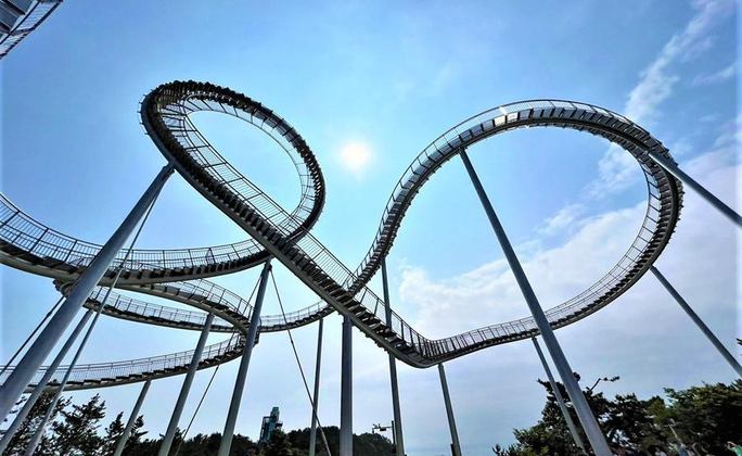 在2021年底落成的新景點浦項市的環湖公園「Space Walk」,由德國藝術家與浦項政府、浦項鋼鐵等聯手製成,建立了333公尺的雲霄飛車步道,外觀看起來就像遊樂設施,但卻是可供行人行走於上的觀景台天空步道,不管從哪個角度看,浦項「Space Walk」以彷彿雲霄飛車般的軌道都給人種震撼感,拍照起來很壯觀,成為浦項的打卡熱點。