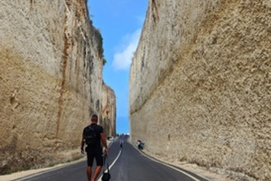 筆直延伸於高聳岩壁之間的公路景觀,兩側壯闊石灰岩峭壁宛如天然峽谷,陽光灑落時呈現層次分明的岩石紋理,畫面極具震撼感,也因此成為熱門打卡與婚紗拍攝地點。
