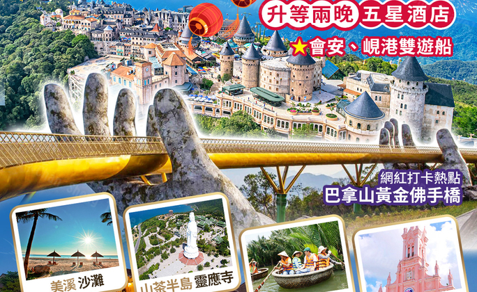 賀歲超值峴港~巴拿山佛手橋、會安、峴港雙遊船、迦南島竹籃船5日~(升等2晚五星)