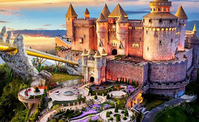 巴拿山上有一座特別的金色橋樑,從遠處乍看宛若峴港上空雲層裡的一條絲帶。撐起「黃金橋」的巨大雙手布滿青苔,風化效果營造出歲月和蒼桑的美學之感。巨手托捧著金色橋身,聳立海拔約1400公尺的雲霧之上,更帶有一點禪意,天氣晴朗時,視野一望無際,當大霧時,橋就像浮在雲海之中,另有一番淒美意境。【巴拿山+雲端纜車】巴拿山位於峴港市西南方約25公里處,是全世界最知名的法式山城。海拔1,487公尺,山上氣溫比陸地平均低6~8度,地勢優美、涼爽宜人。整個地形平坦像縮小的平原之前種植很多的香蕉,因此被戲稱為Banana Hills,後來簡稱Ba Na Hills。因此在法殖民時期,被法國軍隊蓋成渡假村作避暑用。纜車於2009年3月25日,正式營運當時就創下金氏世界紀錄「全球最長及落差最大的單纜吊車」項目。在短短四年後的2013年3月29日,它再度打破了自己世界紀錄的長度和高度,完成了一線直達山頂的直通纜車;總長5,801m,而落差高達1,368m。從景區入口的 "TocTien Station" 直達山頂的 "L'indochine Station"。整個搭乘 20-25分的路程中享受(步步高昇)的情境.藍天白雲.前面的山巒.轉眼又到你的身後.一座一座山.一層一層的爬升。【夢想公園】是一個綜合娛樂主題分文三層樓包括多種室內遊戲: 音樂快車、騎樓遊戲、侏羅紀公園、鐵軌卡車、搖擺騎馬比賽、室內靶場、小汽車比賽、探險鬼屋、氣球水池(自費參加: 如3D,4D,5D電影、鬼屋、投幣遊戲等等及各色各樣遊戲等… 在此您可盡情享受公園內各項服務設施。【巴拿山小火車】造型可愛,明黃色的軌道小火車,一次能運載80人,每小時可運載1600人上山。小火車連接巴拿山山腰,下車後可參觀Amour花園、和供有巨大佛像的靈應寺,沿途還能看到以浪漫紫色搭配白色的歐式建築群,仿佛身處歐洲小鎮,如詩如畫。