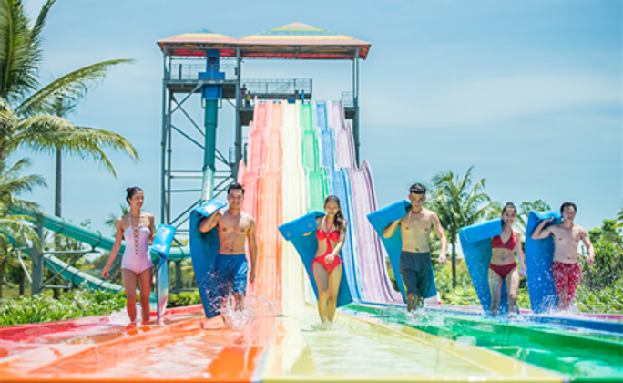 以一條河隔開分開4個區域,分別是遊樂園,風情街,水上樂園和動物園。園區小河環繞,風情街完整複制了會安古鎮及歐洲小鎮Tone的建築,掛滿各色五彩綢布燈籠的街道,非常的夢幻和華麗。園內遊樂設施有95種室內遊戲,4D影院、3D博物館、95米高的跳樓機瑞士塔和一個能容納2500人的水幕音樂表演劇院。白天和夜晚園區都組織豐富多彩的表演,特別是到了晚上的水幕音樂噴泉劇院和河邊船上的表演更加驚豔。一起來探索這個為遊客提供世界一流設備的主題樂園!