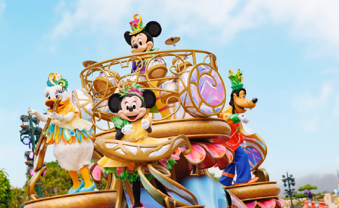以全新華麗無比的「奇想騰飛」遊行揭開序幕,在城堡世界裡與米奇等迪士尼明星一同度過歡樂國度!