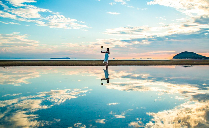 長約1公里的美麗沙灘,面對瀨戶內海的海岸線,以緩緩落下的動人夕陽而著稱,被選為『日本夕陽百選』之一。當夕陽漸漸西沉,火紅的晚霞倒影在海水退潮後遺留下的水窪上,成為倒映夕照彩雲的巨大鏡影,仿如置身顛倒世界,令人神往。在沙灘上找到一面大型水窪,蹲低身姿,使相機視角與地面平行,就能拍出天空之鏡的的魔幻美景,或運用道具巧思,或站或跳,拍出專屬的天空之鏡。【四國中央商店街】