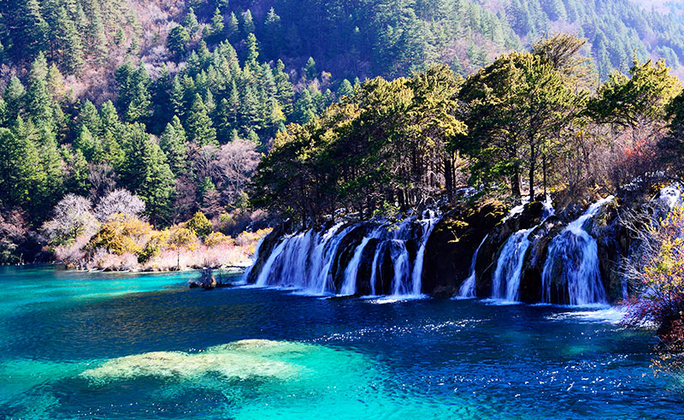 【九寨溝】高峰、彩林、翠海、疊瀑和藏族風情被稱為五絕。九寨溝的水更是九寨溝的靈魂,因清純潔淨、晶瑩剔透故有九寨溝歸來不看水之說。九寨溝四季景色都十分迷人;尤其在秋天來臨時,葉色隨著變,五顏六色美不勝收。沒冬季的九寨溝,素裹銀裝的山巒、變幻冰晶的的湖泊,在日出日落的映照下充滿詩情畫意,營造出一個晶瑩剔透的『童話世界』。