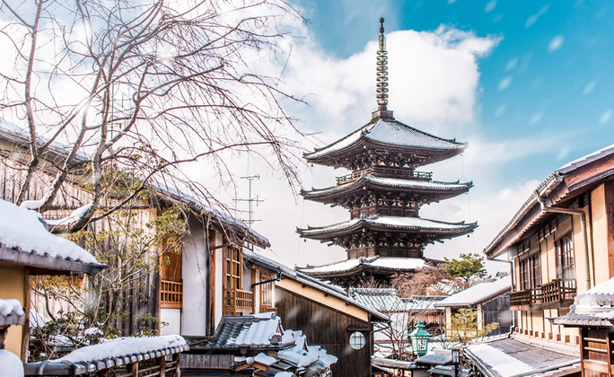 為京都最古老的寺院,建於公元798年,占地面積13萬平方米,相傳由唐僧在日的第一個弟子慈恩大師創建。現存清水寺為1633年重修。不論春季的櫻花,秋季的楓景都十分誘人,大殿前為懸空的「清水舞台」,由139根高數十米的大圓木支撐綜橫交錯取得支撐力,寺院建築氣勢宏偉,結構巧妙,未用一根釘子。大殿所供俸面十一面千手觀音平常無法見到,33年才公開一次。地主神社位於清水寺正殿北側,神社內良緣之神極受年輕人的喜歡,在這裡終日可見祈求良緣的年輕女性虔誠參拜,熱鬧非凡。據說舉凡從舞台及姻緣石走過一遭者,除可健康長壽外更可締結良緣。