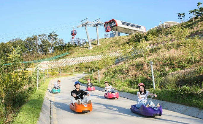 【江華斜坡滑車(LUGE)】是首都圈西部地區唯一的斜坡滑車,而在江華海岸渡假村內除了斜坡滑車外,還設有纜車、美食街、主題步道等設施,為遊客帶來快樂、幸福與愛。距離繁華的市中心不遠,卻能一覽山海景色並感受幽靜的自然情趣。一邊聞著濃郁的林木香氣,一邊搭乘纜車到山頂,便能在觀景臺感受夕陽下美麗的江華島海灘氛圍。江華斜坡滑車全長1.8km,是東洋最長的斜坡滑車,順著滑道一路滑行,可以感受到下滑的速度感與刺激感。而整條路線採取全家人都能同樂的有趣主題設計,適合親子遊客來此共度愉快的時光。