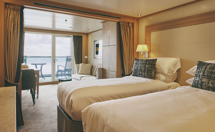 此房型配有陽台。艙房包含:浴缸、免治馬桶、電視、步入式衣櫥、陽台;艙房內設備:保險箱、浴袍、沐浴露、洗髮精、潤髮乳、牙刷、原創托特包、拖鞋、吹風機、刮鬍刀、浴巾、瓶裝水(每人每日最多2瓶)