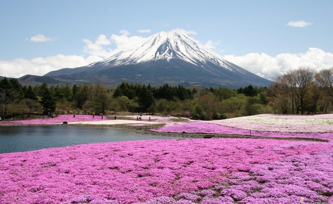 富士山下河口湖町本栖的會場欣賞美麗的芝櫻。在芝櫻祭期間,美麗的芝櫻編織成美麗的花卉圖騰,就如棉絨般儘情揮灑在雄偉的富士山下,約80萬株的芝櫻以濃淡不一的紅、粉紅、白色的花朵巧妙配置,形成如同一隻巨大的粉龍盤踞在龍神池畔般,恣意在富士山麓上演繽紛的視覺秀,並將春季的浪漫展現無遺。