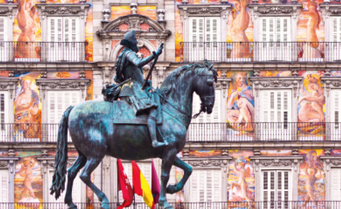 【馬德里Madrid】是西班牙的首都與最大城市,位於伊比利半島的中心地帶。這座城市在16世紀被菲利普二世選為首都後迅速發展,逐漸成為西班牙的政治、文化與藝術中心。馬德里擁有世界級的博物館群,包括普拉多博物館、索菲亞王后國家藝術中心與提森-博內米薩博物館,收藏無數大師名作。市中心的太陽門廣場與馬約爾廣場是感受城市活力的熱鬧場所,皇宮則展現王室的輝煌與歷史。【馬德里皇宮Palacio Real】(下車參觀)西班牙王室的正式宮殿,也是歐洲面積最大的王宮之一。現址原為摩爾人的阿爾卡薩爾城堡,18世紀在火災後由國王菲利普五世下令重建,採用巴洛克與古典主義風格,外觀莊嚴宏偉。【太陽門廣場Puerta del Sol】位於馬德里市中心,是城市最熱鬧、最具象徵性的廣場之一。這裡自古是城市的交通與商業樞紐,如今則是遊客與市民聚會的熱門地點。廣場名稱意為「太陽之門」,源自15世紀城門上的太陽徽飾。廣場中央的「零公里標誌」是西班牙國道的起點,吸引許多人拍照留念。【格蘭大道Gran Via】是馬德里最繁華、最具代表性的街道之一,全長約1.3公里,連接西班牙廣場與阿爾卡拉街。建於20世紀初,被譽為「馬德里的百老匯」,沿途聚集了華麗的歷史建築、劇院、百貨公司與國際品牌商店。街道兩旁的建築融合新藝術風格、裝飾藝術與新古典主義。【聖米格爾市場Mercado de San Miguel】位於馬德里市中心馬約爾廣場附近,是一座擁有百年以上歷史的著名美食市場。市場建於1916年,採用優雅的鐵與玻璃結構,經過修復後成為結合傳統與現代風格的美食地標。館內聚集各式西班牙特色美食與飲品,包括伊比利火腿、小吃Tapas、新鮮海鮮、橄欖、起司與甜點,還有多種西班牙葡萄酒與雪莉酒可供品嚐。