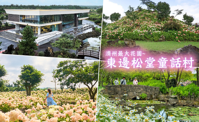 【松堂童話村主題花園(5-8月賞繡球花、11-2月賞山茶花)】濟州島松堂童話村主題花園是一個結合自然、文化和神話的公園,以「濟州的樹、石、文化與神話、四季花卉」為主題。園區內有適合拍照的景點,如瀑布、小橋、花園和石像。