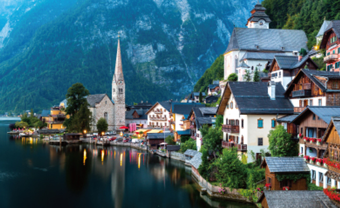 依山傍水的奧地利小鎮,如一條精美的絲帶遊走於翠林茂密的青山和碧綠清澈的湖畔之間,小鎮裡的木造建築精緻非凡,絕妙地融於畫作中一般的自然景色之中。