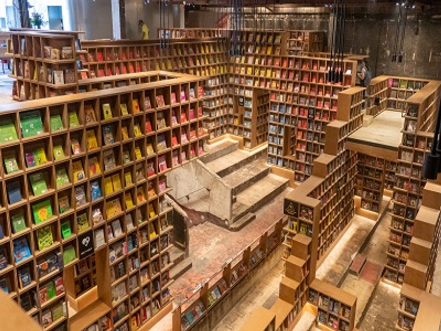 BookXcess 利用了原先戲院的階梯空間來打造一座壯觀的書海迷宮。走入迷宮,每個轉角處都充滿驚喜,有些空間狹窄逼仄,走過時還得彎腰低頭,呼應在外頭穿梭茨廠街小巷 探險之感;有時又突然豁然開朗。一格格四方形的木制書架錯綜交疊成一場大型的幾何冒險遊戲。牆身多處盡可能保留原始樣貌,裸露的紅磚水泥和火舌留下的痕跡,帶有濃厚的街頭工業風。