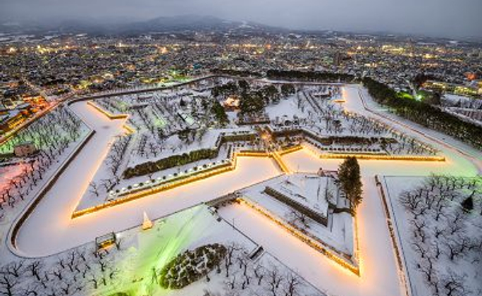 來到函館的地標-五稜郭公園,五稜郭以造型非常獨特的星狀碉堡聞名,明治維新時期支持幕府人士,抵抗天皇軍隊最後一站(箱館戰爭1868~1869年)的發生地點,因此在日本近代史中佔有重要地位。