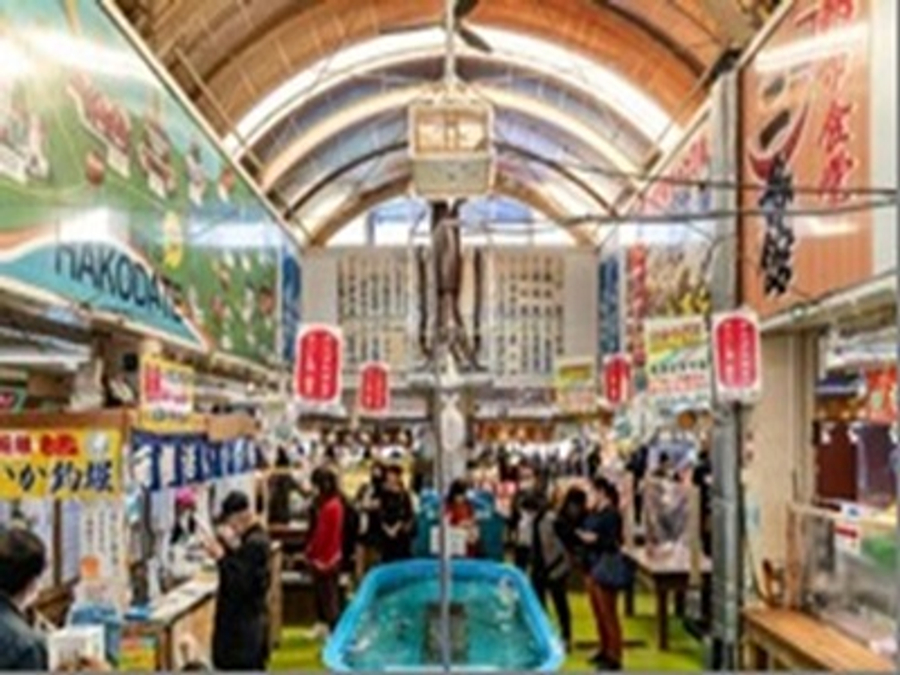 【函館朝市】來到北海道就不能錯過這裡盛產的 各式海鮮,函館朝市位於 JR 函館站西口不遠處,市場一帶集中了大小 400 多家水產店,形成了一個獨據特色的大型市場。營業時間一般從上午8:00營業至中午1:00左右,市場裡嘈嘈嚷嚷,叫賣聲不絕於耳,運貨車和購物客令狹窄的通道顯得熱鬧擁擠,充滿市井氣息。
