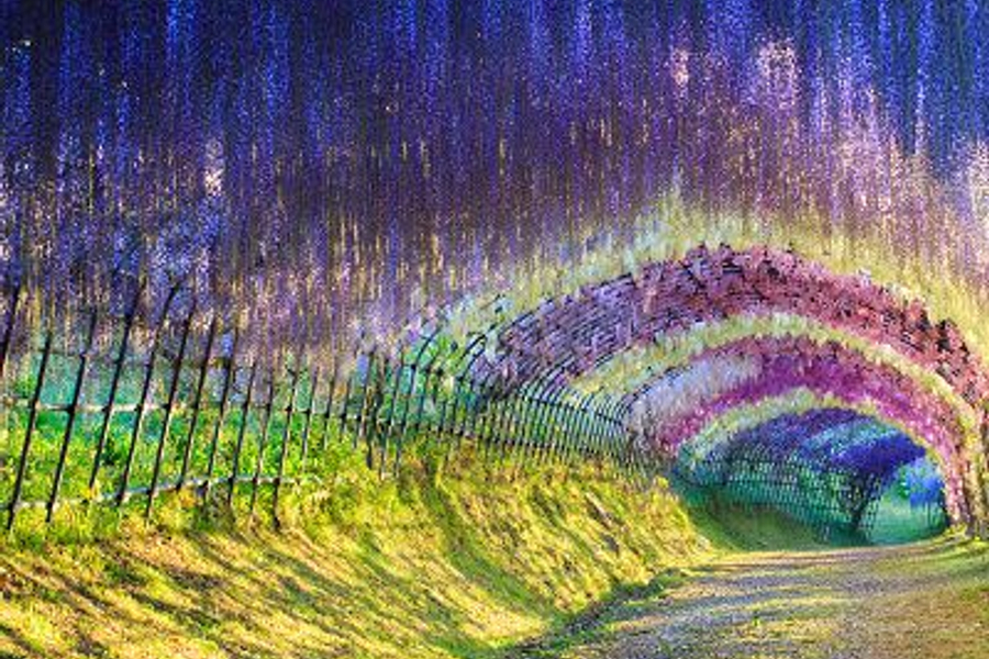 【足利花卉公園~紫藤花期預計4/15~5/14】最具代表的花卉,屬於多年生藤蔓植物,莖具纏繞性,直徑達10公分以上,常被用作棚架觀賞植物,花狀花序側生在枝端,20~30朵紫色小花整齊排列,開花時蝶形花朵成串下垂,長度可達15~30公分,花量大時彷彿紫色瀑布,美得令人屏息。公園裡的紫藤約300棵,每逢盛開時聲勢驚人,被公認是全世界最漂亮的紫藤花美景。