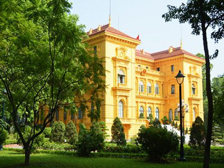 【越南總督府】建於 1906 年的黃色法式建築『主席府』,其原是殖民時期印度支那的總督府,後成為胡志明主席處理國政之處。《註:外面欣賞,不入內》