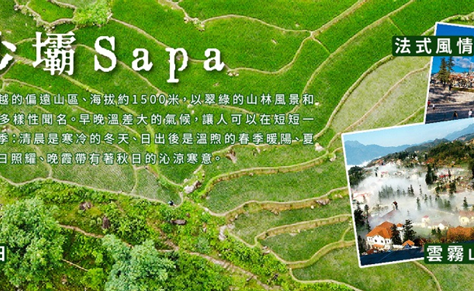 第 1 天 桃園國際機場/河內國際機場→還劍湖→36古街(含電瓶車/不含小費)→骨董列車之旅(臥舖:2人一室) ※列車發車時間,以出團資料為主→老街省。 ※請備簡易手提行李。 集合於桃園國際機場,由專人協辦離境手續之後,搭乘豪華噴射客機飛往飛躍中的越南首都河內。抵達河內機場先將護照交由領隊統一辦理落地簽證手續。 【河內】是一座擁有千年歷史的古城,曾為越南李、陳、後黎諸封建王朝的京城,被譽為千年文物之地,法國殖民統治時期為“法屬印度支那聯邦 ”總督府所在地。1945年越南 “八月革命”勝利後,越南民主共和國 (1976 年改名越南社會主義共和國 ) 定都於此。【還劍湖 Hoan Kiem Lake】車遊:位於河內巿的鬧區中間,所有的高級大飯店幾乎都集中在這湖區的附近。還劍湖湖名來自於15世紀的傳說故事。傳說當年黎太祖藉由一把神龜所出借的神劍率領越南人成功攻退中國明朝的軍隊,勝利後,黎太祖順利當上新任國王,他到湖邊漫步,神龜突然出現湖面要求拿回神劍,黎太祖因而將擲向神龜。此湖因此被命名為還劍湖。實際上,還劍湖中現在仍是幾隻龐大的烏龜的居所呢!似乎更加深了這個神話的可性度與傳奇性。還劍湖的面積雖然不大,然湖岸邊綠草茵茵,一向為河內巿民休閒納涼的好去處。註:還劍湖車上介紹【電瓶車遊36古街】輕鬆瀏覽這古色古香的傳統商店街,感受在地人的怡然自得。源自十五世紀,每一條狹窄的街道均以當時交易的商品來命名,如絲街、米街、紙街、珠寶街等,共有36條,並於古街內可自費訂製一個花漾年華旗袍、包包、鞋子,完全為您量身訂做的回憶。※請自付小費:美金1元或同等值的越南盾。隨後前往河內火車站搭乘過夜列車前往老街市。 【過夜臥鋪火車】走進火車站的月台,昏黃的夜燈,濃濃的懷舊風油然升起,雅致又愜意。搭火車前往沙壩是別具風格的旅遊體驗,昏黃的燈光搭配濃濃的懷舊風,彷彿穿梭在舊時代中。在緩慢的火車前進下,隔日早晨抵達老街火車站。行程提醒: 1.河內~沙壩 區間行駛的夜寢列車,車廂數量十分有限,額滿後即無法追加,敬請知悉。 2.報名小孩不佔床者,於火車上仍有個人床位可以使用(嬰兒無床位),敬請知悉。 3.夜寢列車每節車廂皆有提供公用廁所、洗水台,讓旅客可以從事簡單盥洗(刷牙、洗臉),建議貴賓可以事先準備小行李,可裝輕便的盥洗用具及貴重物品。 4.安排夜寢軟臥列車由河內前往老街(2人1室),這是別具風格的旅遊體驗,昏黃的燈光搭配濃濃的懷舊風,彷彿穿梭在舊時代。 5.夜寢列車發車時間:以說明會資料為主。 6.火車於舊鐵軌上行駛會有晃動的機械聲及輪軌摩擦聲會略顯吵雜,敬請知悉。 7.請依個人睡眠狀況,可自備耳塞備用。 **隨團贈送:五天網卡(佔床者)、車上礦泉水每人每天一瓶** 建議自費行程:1.全身按摩90分鐘:$1200台幣/每位 (※含按摩小費) 2.越式洗頭90分鐘:$1200台幣/每位 (※含按摩小費) 作業規定: ▲10人以上成行,10人以上派台灣領隊隨行。 ▲訂購報名確認後,請預付訂金每人NT$10,000,並請於最晚出發日前7日或通知成團時繳清團費。 ▲當團人數低於10人以下,本公司將依觀光局定型化契約精神於團體出發7日前通知取消出發。 ▲如個人因素無法成行,將依旅遊定型化契約之取消規定辦理。如行程航班安排為加班機或包機形式,將依照實際損害請求賠償,敬請留意。 ▲本行程以團體模式作業,行程中恕不接受脫隊要求。 ▲本優惠報價是以雙人入住一房計算,若遇單人房需補單人房差。 ▲所有活動如不參加均無法退費,亦不可轉讓。 ▲上述行程的交通時間及餐食、住宿、僅做參考,以最後通知的行前說明資料為準。為維護旅遊品質及貴賓們的權益,在不變更行程內容之前提下,將依飯店具體確認回覆的結果,再綜合當地實際交通等情況,為貴賓們斟酌調整並妥善安排旅遊行程、飯店入住之先後順序或旅遊路線,請以說明會或最後確認的行程確認單資料為準。 ▲如遇不可抗力之因素,本公司保有變更同等飯店行程順序之權利,但保證不會影響行程內容,敬請見諒! ▲請旅客遵守航空公司規定,需於起飛2.5小時前報到;機場櫃檯起飛前一小時即關櫃,無法再辦理任何登機手續。 ▲因應煙害防治法,酒店所有客房及宴會場地均全面禁煙,需吸煙之貴賓請移駕至酒店指定戶外抽煙區,若於上述禁煙場所吸煙者,酒店將依據法規處新臺幣五千元至一萬五千元以下之罰鍰,並得按次連續處罰,感謝您的合作。 ▲越式料理為六菜一湯附水果、中式餐食享用八菜一湯附水果、飯店內及自助餐不含水酒,自助餐如遇人數不足則改為享用套餐 。餐食風味:體驗當地的特殊風味菜色飲食,由於個人口味均有不同,故請以嚐鮮的心情來體驗當地的風味餐。 ▲各地風俗民情不同,國外的素食習慣大多是可以食用蔥、薑、蒜、蛋、奶等,除華僑開設的中華料理餐廳外,多數僅能以蔬菜、豆腐等食材料理為主;若為飯店內用餐或一般餐廳使用自助餐,亦多數以蔬菜、漬物、水果等佐以白飯或麵食類。故敬告素食貴賓,海外團體素食餐之安排,無法如同在台灣般豐富且多變化,故建議素食貴賓能多多見諒並自行準備素食罐頭或泡麵等,以備不時之需。 ▲本行程設定為團體旅遊行程,故為顧及旅客於出遊期間之人身安全及相關問題,於旅遊行程期間,恕無法接受脫隊之要求,造成不便之處,敬請見諒。 ▲考量旅客
