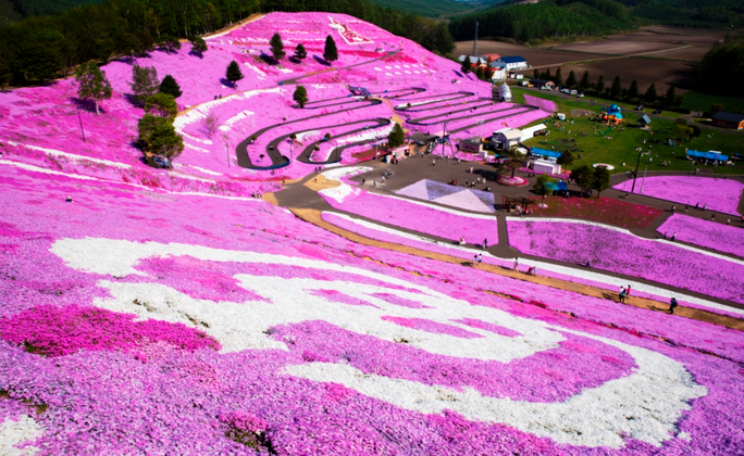 【東藻琴芝櫻公園】約10公頃的丘陵的斜坡上,五彩繽紛的芝櫻爭奇鬥艷地綻放美麗,彷彿鋪上了粉紅色地毯,景色壯觀。從展望台或摩天輪可將園內的景色盡收眼底。