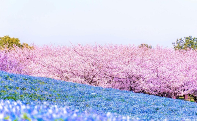 【海之中道海濱公園】在櫻花季時,約有1600棵櫻花樹盛開,特別是染井吉野櫻和大島櫻,沿著自行車道形成美麗的櫻花隧道,讓人彷彿走入童話世界。 此外,公園內的花之丘還會同時綻放約150萬株粉蝶花,藍色花海與櫻花相互輝映,形成獨特的視覺饗宴。※備註:若因三大蟹缺貨或客滿無法提供時,晚餐則改為涮涮鍋吃到飽,並退費3000日幣。敬請見諒。