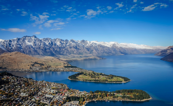 中央奧塔哥地區Central Otago,紐西蘭南島觀光業的瑰寶,最為典範的代表是渡假小鎮,位於南阿爾卑斯山脈的尾端,周圍被壯觀的山脈環繞,山腳下則是由冰河切割出來的-Lake Wakatipu瓦卡第浦湖是一座高山湖泊,全長84公里,湖水面積達291平方公里是紐西蘭境內第三大湖,最深達410公尺。皇后鎮從過去三十年間從一個寧靜的湖濱農業小鎮發展成一座全年無休的觀光都市。乾燥的大陸氣候,加上純淨的空氣,使得陽光得以在此千變萬化,創造出別處無法擁有的獨特景觀。