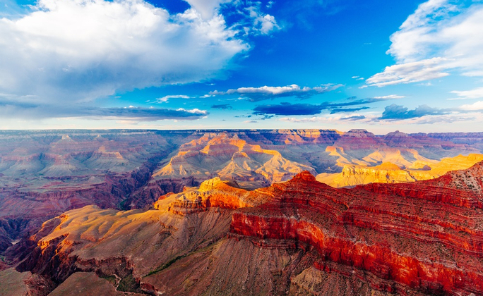 大峽谷兩岸都是橘紅色的巨岩斷層,經過三億年的自然風化,地震,河流的衝擊和切割,大自然利用鬼斧神工的創造力鐫刻得岩層嶙峋。