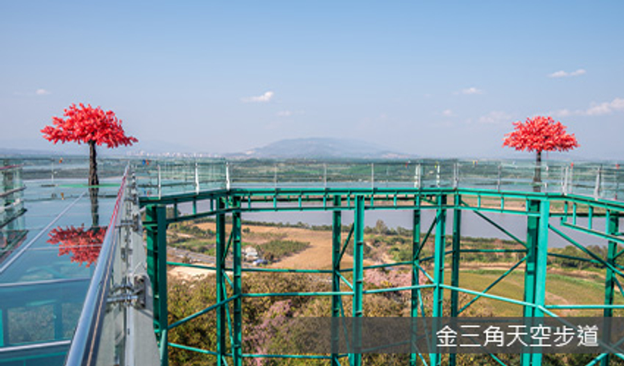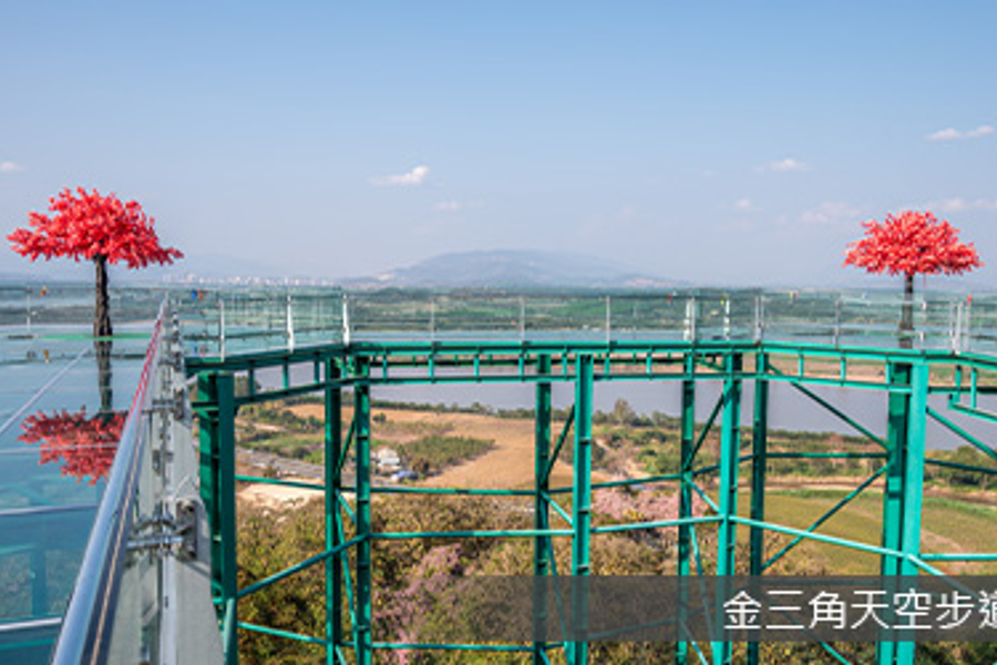 金三角天空步道擁有獨特的U字型設計,透明強化玻璃打造的觀景平台