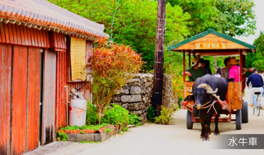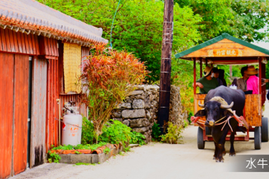 竹富島可以體驗搭乘「水牛車」在村落間來去穿梭,一坐上水牛車,負責駕馭水牛的「車伕爺爺」就會彈起琉球傳統樂器三線,一邊解說竹富島的歷史與植物,讓乘客們在歌聲樂曲的伴隨下於聚落裡走走晃晃。