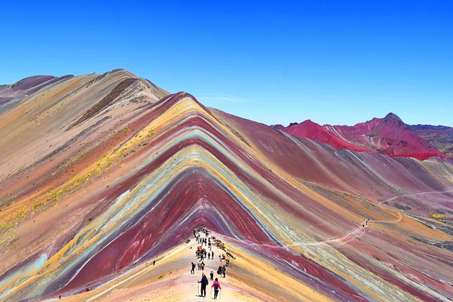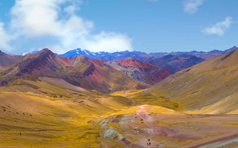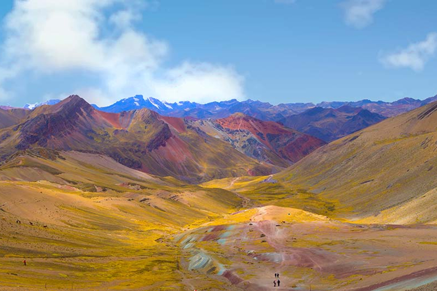 這座山脈宛如一道彩虹落在人間。天氣晴朗時,您還有機會遠眺庫斯科地區最高的聖山——奧桑加特雪山,白雪皚皚的山峰與七彩的彩虹山形成強烈對比。