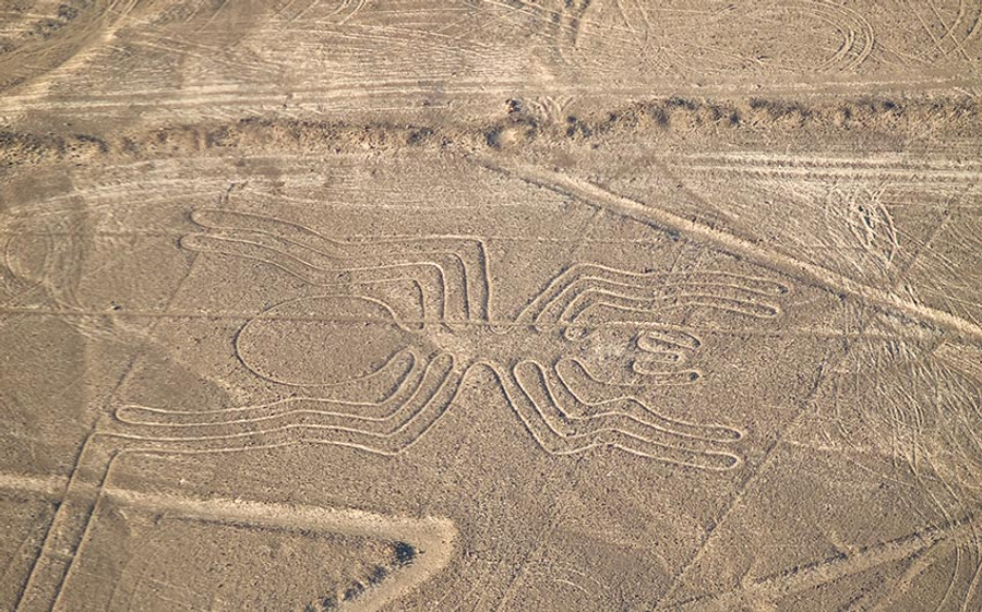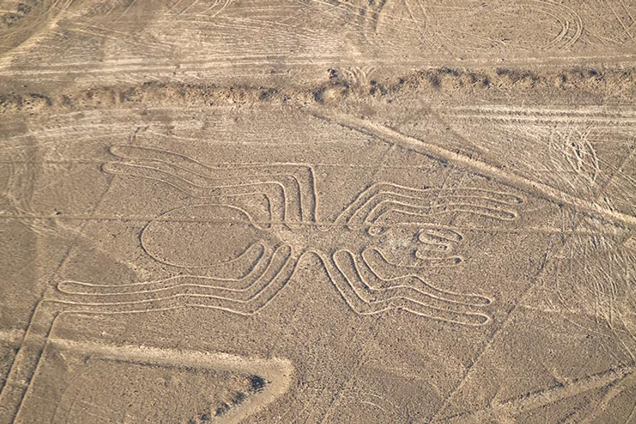 1994年列入世界文化遺產。這片荒漠上刻畫著巨大的蜂鳥、猴子、蜘蛛、外星人等圖案。納斯卡人移除地表深色岩石露出淺色土壤的技法,在無雨無風的氣候下保存了兩千年。唯有從空中俯瞰,才能領略其宏大規模與精準幾何構造。
