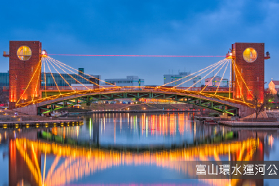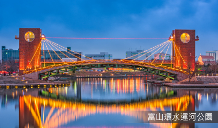 位於富山縣的中心,前身為富岩運河的靠船碼頭,引入富岩運河並且以環水流通概念加以發展,鞏固了富山都市基盤。連著富山 灣和日本海域,背後壯麗的立山連峰一脈形成,有山有水的好景致。園區內設施大致上有瞭望台、天門橋與泉水瀑布廣場,在假日時還會在野外劇場舉行大型表演,還有享有日本(及世界最美星巴克」(2008)美譽的星巴克。