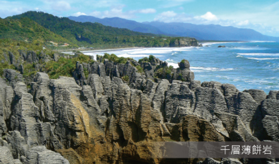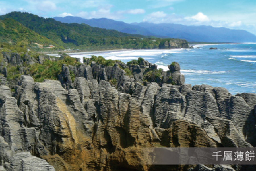 千層薄餅岩紐西蘭自然保護局用“自然千層餅菜譜”來形容並介紹這些千層餅石頭形成的過程,千層岩屬於海洋沉積結晶白雲岩,石質堅硬緻密,在層與層之間夾一層淺灰岩石,石紋成橫向,外形似久經風雨侵蝕的岩層。它紋理清晰,成層狀結構,多凹凸、平直,線條流暢,時有波折、起伏,有人形象地稱它爲「大自然的年輪」。顏色灰黑、灰白、灰、棕相間,其棕色稍顯突出。這些由於風化和海水侵蝕造就的美景,展現了大自然的鬼斧神工。
