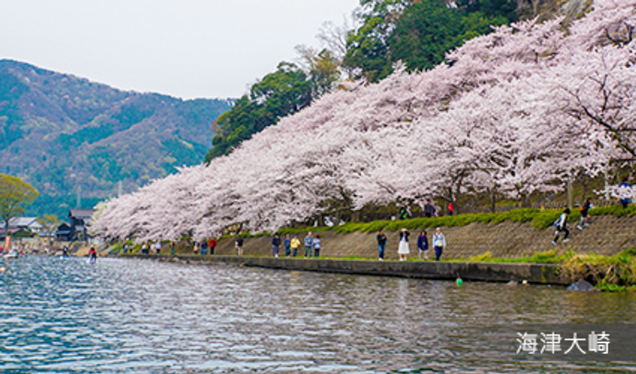 海津大崎在琵琶湖國定公園中屈指可數的景觀勝地,位列琵琶湖八景之一。這裡全年均可欣賞壯闊的奧琵琶湖自然風光,享受舒適的駕車遊路線及自然散步道。此外,春天約 800 株絢爛的染井吉野櫻將美麗綻放,綿延 4 公里十分美麗。