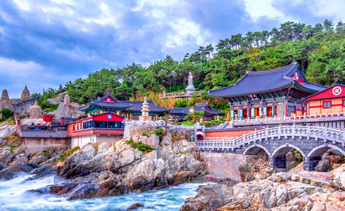 海東龍宮寺位於釜山東海岸,是韓國唯一一座位於海邊的寺廟,周邊景色非常優美。 龍宮寺由曾經做過恭民王的王師的懶翁大師於1376年創建,該寺廟依山傍海,內有海水觀音、大雄殿、龍王堂、窟法堂、四獅子三層石塔等景觀。