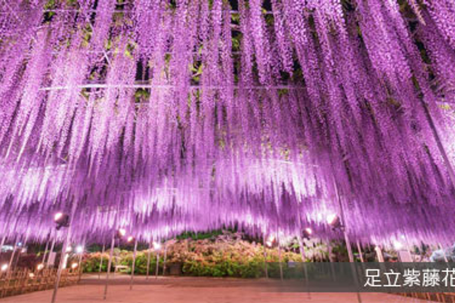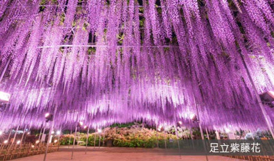 足利紫藤公園有「花的藝術村」美稱,「紫藤」花季期間4月中-5月中,彷彿紫色瀑布美得令人屏息。有600個榻榻米大「大藤」、世上罕見「八重黑龍藤」、「白藤通道」、「黃金藤」、「粉紅藤」、 「紫藤」等;其中「大藤」、「白藤隧道」、「八重黑龍大藤」並列為三大櫪木縣指定天然紀念物。隨著4月中旬開花的「粉紅藤」綻放,揭開紫藤物語序幕,綿延80公尺的紫藤花隧道,淡紅色紫藤、紫藤花、大藤、白藤、八重藤、黃花藤,串起春之頌紫藤花物語,透過“水鏡”效果,倒映在水池中,恍如進入了另一世界。