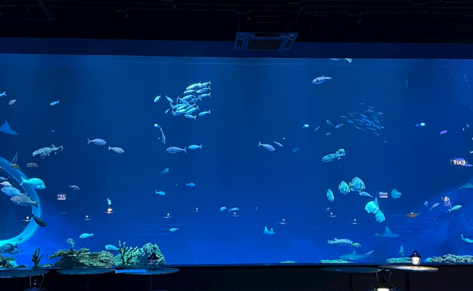 【DMM Kariyushi水族館】這裡利用最新的影像表現與室內設計,打造整座夢幻又迷人的展覽空間,不僅有海洋生物,更連同陸地的生物一起全方面的展示沖繩的自然環境。在榕樹圍繞下的「山原之森」(やんばるの森)能見到淡水魚、爬蟲類和兩棲類的動物,爬上階梯從高處俯視,又或是環繞雨林般的佈景散步都充滿趣味,地上的光影、耳際的聲響都取自當地森林,相當逼真。