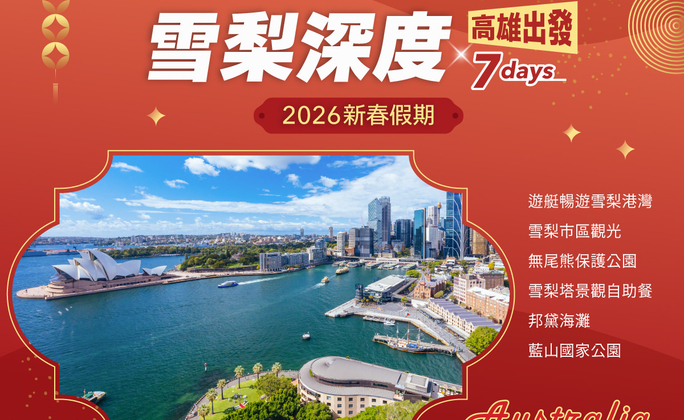 新春 雪梨深度7日~遊艇暢遊雪梨港灣、雪梨市區觀光、無尾熊保護公園、雪梨塔景觀自助餐、邦黛海灘、藍山國家公園
